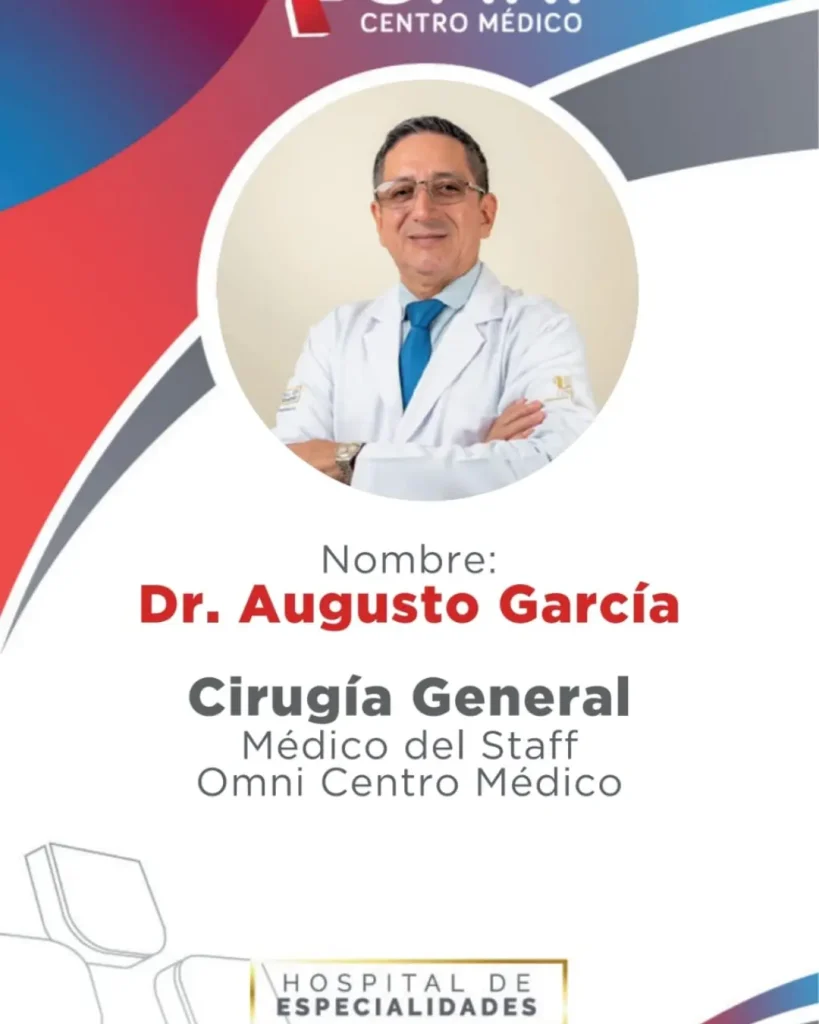 El Dr. Augusto García es un médico especialista con más de 30 años de experiencia en cirugía, reconocido por su ética, precisión y compromiso con sus pacientes. Es experto en cirugía laparoscopica y en procedimientos digestivos, de vesícula, hernias y colon, brindando tratamientos modernos, seguros y efectivos que mejoran la calidad de vida de sus pacientes.Valoración y tratamiento de: